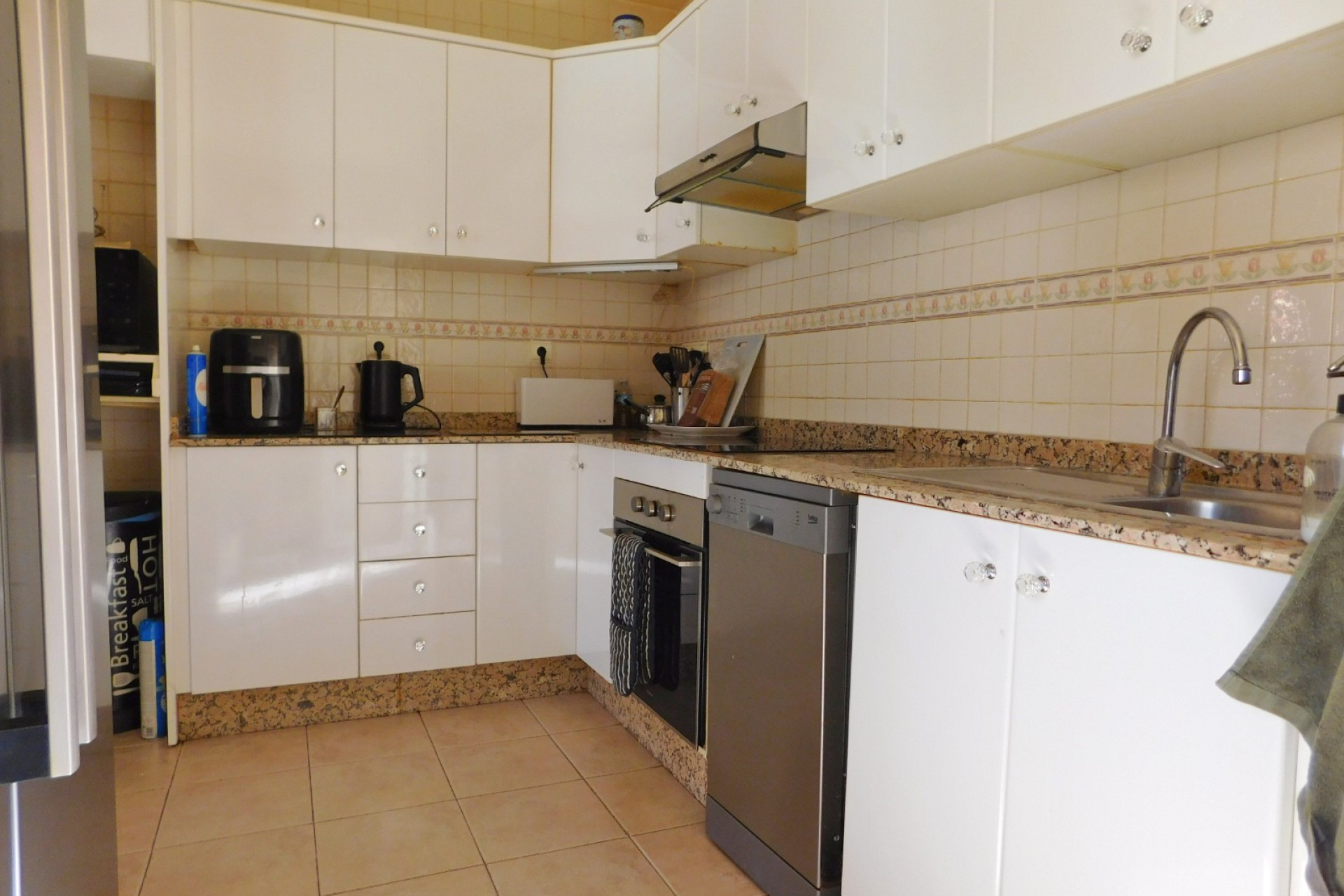 Breve descripción de la propiedad: desde la terraza delantera cubierta se accede al amplio salón y comedor independiente. Desde aquí se accede a la espaciosa cocina totalmente equipada, con acceso al jardín, lavadero y solárium en la azotea, que ofrece unas vistas espectaculares a las salinas de Torrevieja. Los tres dormitorios dobles cuentan con armarios empotrados y dos baños, uno de ellos en suite con el dormitorio principal.