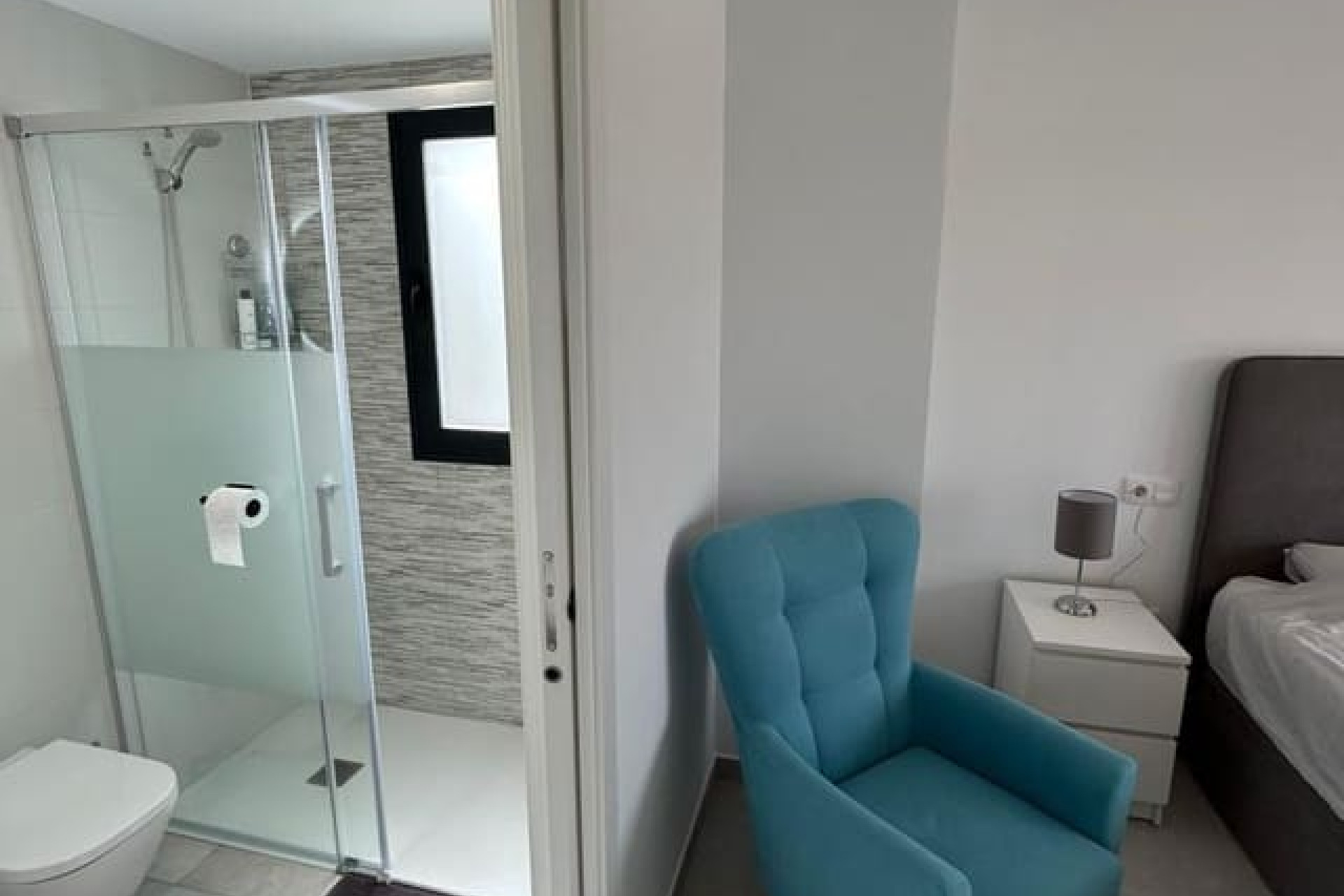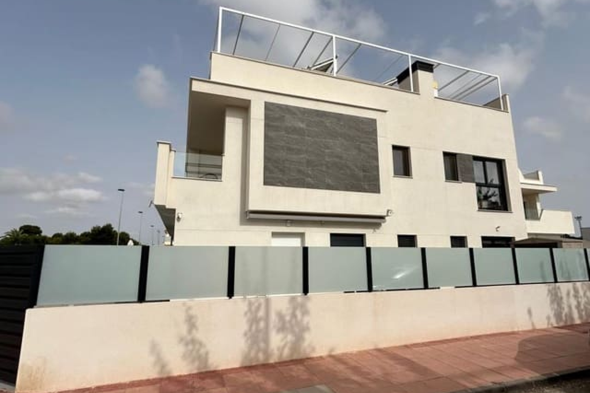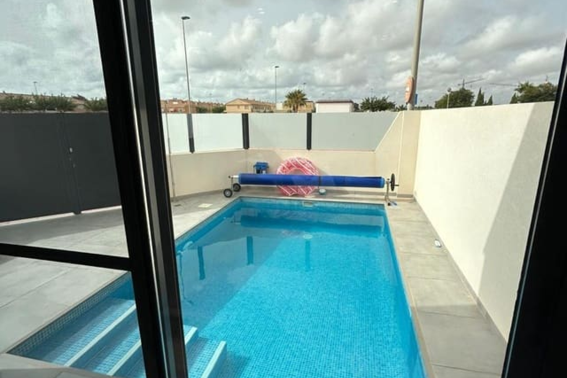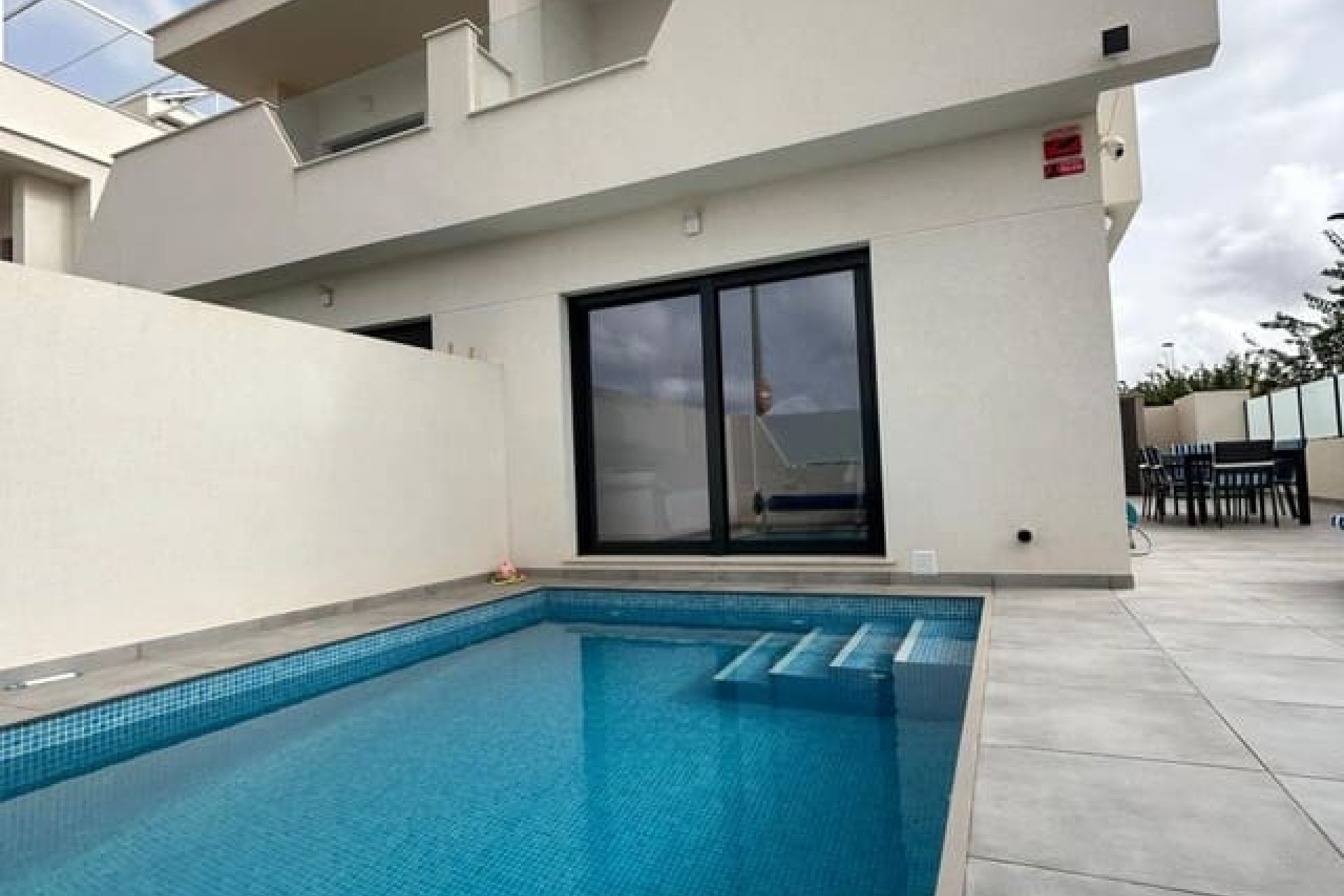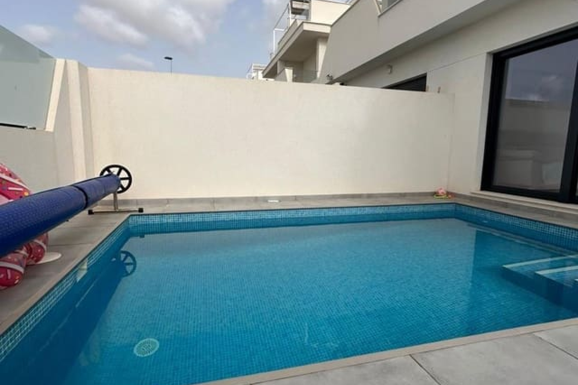 Halfvrijstaande villa met 3 slaapkamers en 2 badkamers, gelegen op het zuidoosten, met privézwembad en eigen solarium in Santiago de la Ribera. Ruim perceel met een afgesloten oprit die leidt naar een groot terras aan de voorzijde. Het grote zwembad bevindt zich aan de voorzijde van de woning en biedt voldoende ruimte om te dineren en te zonnebaden. De woning beschikt over een ruime woonkamer met uitzicht op het zwembad en een moderne, open keuken met alle voorzieningen. Achter de keuken bevindt zich een tweepersoonsslaapkamer met inbouwkasten en een deur naar het zijterras. Op de begane grond is tevens een moderne doucheruimte. Op de eerste verdieping bevinden zich twee tweepersoonsslaapkamers met inbouwkasten. De slaapkamer aan de voorzijde van de woning heeft toegang tot een terras. Ook op deze eerste verdieping bevindt zich een moderne doucheruimte. Een trap vanaf de eerste verdieping leidt naar uw eigen privé-dakterras met buitenkeuken. Nog een fantastische buitenruimte. Deze woning is slechts twee jaar oud en wordt volledig gemeubileerd verkocht. Het strand is op loopafstand en het winkelcentrum Dos Mares en het winkelpark Pinatar liggen op korte rijafstand. De luchthaven van Murcia ligt op ongeveer 30 minuten rijden en Alicante op ongeveer een uur rijden. Er zijn ook een aantal bars en cafés in de buurt van de accommodatie. Santiago de la Ribera is een prachtige stad aan de oevers van de Mar Menor. Het is de kustplaats van de stad San Javier en begon als een eenvoudig vissersdorp. Het is nu een populaire vakantiebestemming die niet alleen Spanjaarden, maar ook toeristen uit heel Europa aantrekt. Santiago heeft een moderne uitstraling, maar behoudt nog steeds zijn 'vissersdorp'-sfeer. Het heeft een prachtige boulevard met majestueuze palmbomen en 2 kilometer aan mooie zandstranden. Vanuit hier kunt u een boottocht maken over het kalme water van de Mar Menor naar de La Manga Strip aan de overkant. Het belangrijkste winkelgebied bevindt zich in de stad San Javier, maar er zijn ook een aantal winkels in de smalle straatjes om rond te snuffelen; probeer het eens op woensdagochtend wanneer er een grote straatmarkt is.