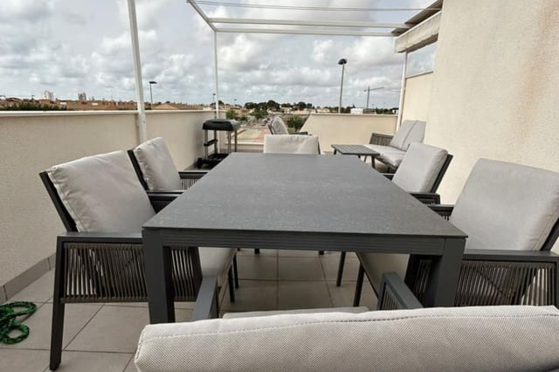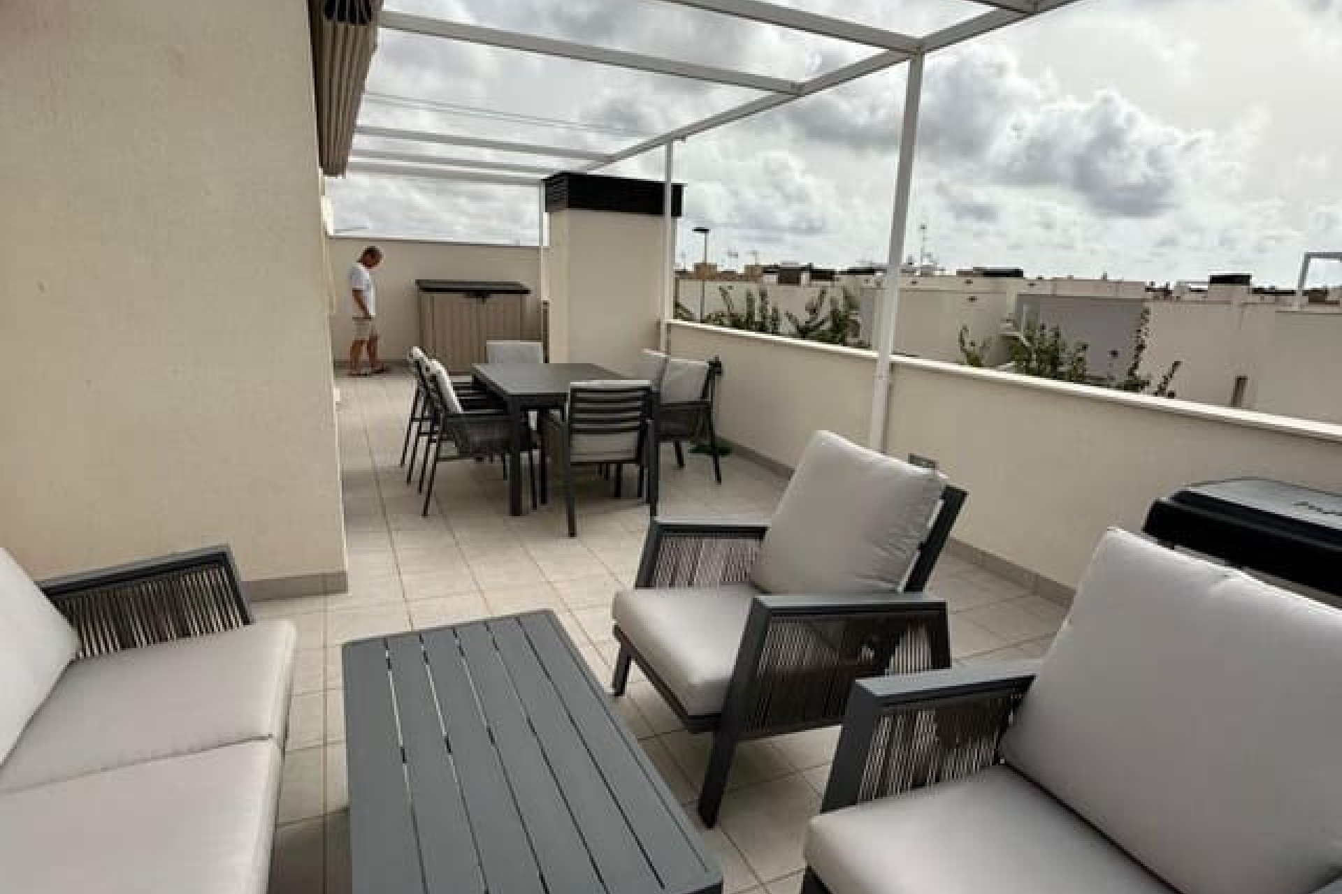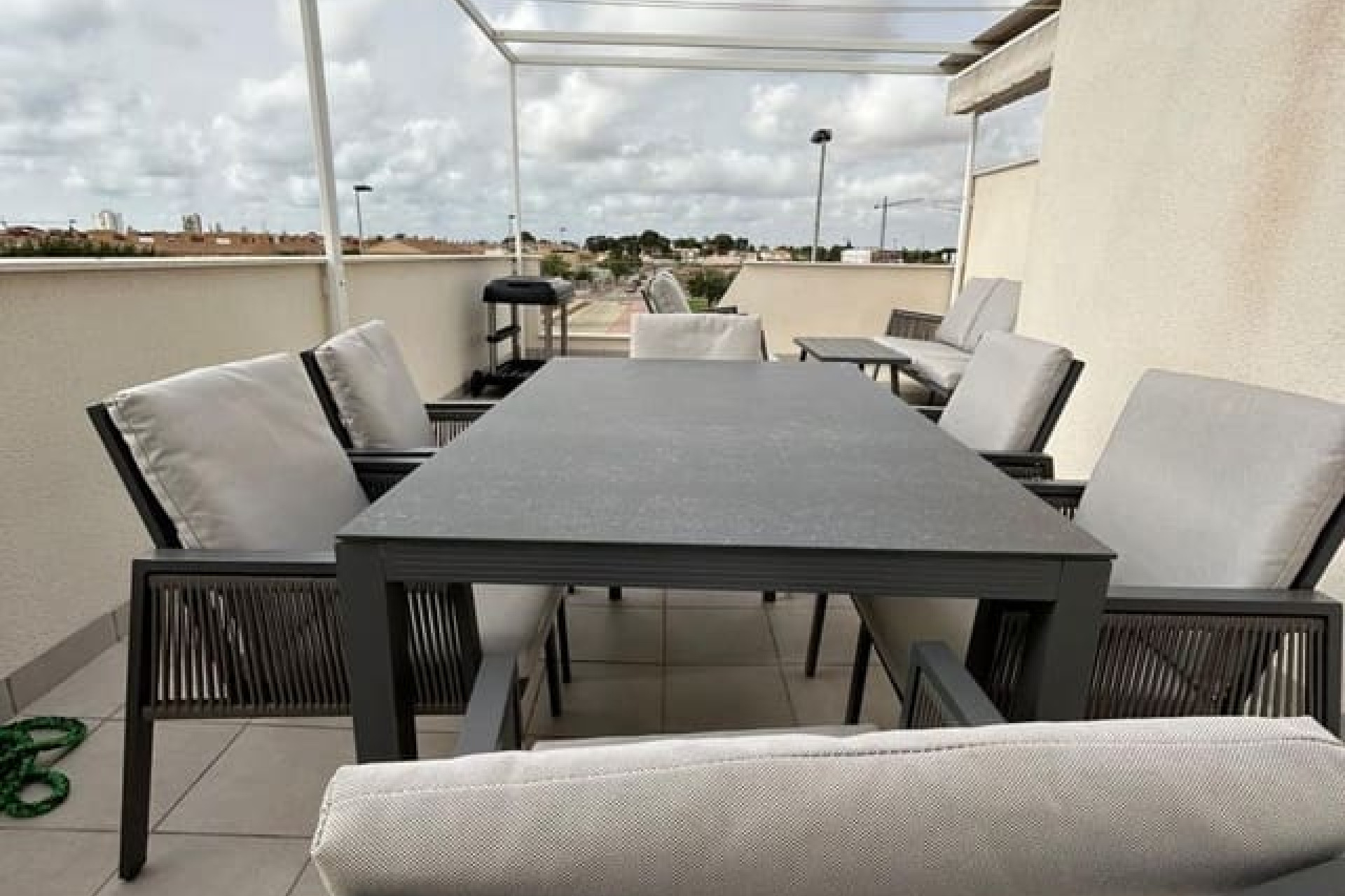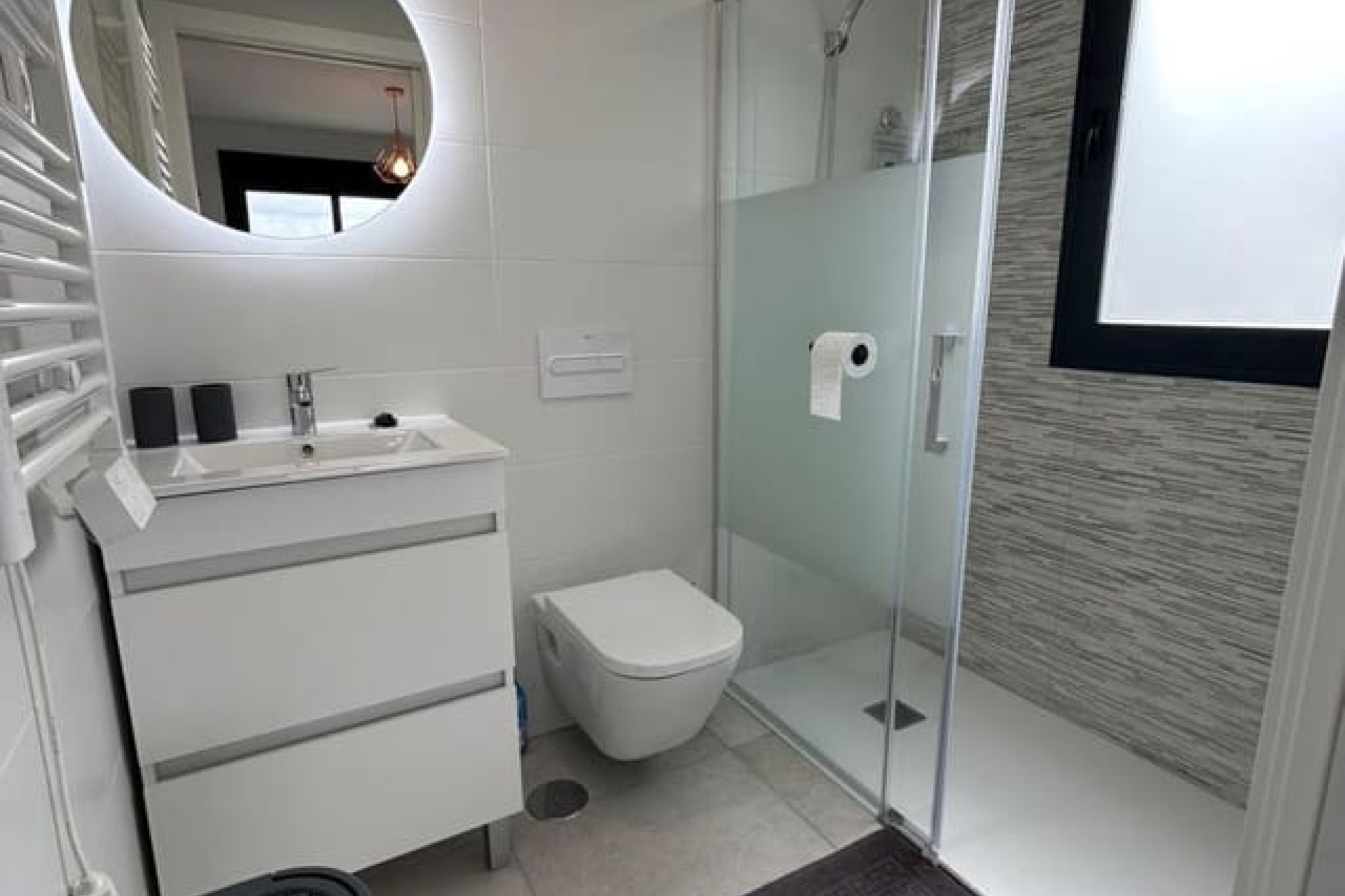 Halfvrijstaande villa met 3 slaapkamers en 2 badkamers, gelegen op het zuidoosten, met privézwembad en eigen solarium in Santiago de la Ribera. Ruim perceel met een afgesloten oprit die leidt naar een groot terras aan de voorzijde. Het grote zwembad bevindt zich aan de voorzijde van de woning en biedt voldoende ruimte om te dineren en te zonnebaden. De woning beschikt over een ruime woonkamer met uitzicht op het zwembad en een moderne, open keuken met alle voorzieningen. Achter de keuken bevindt zich een tweepersoonsslaapkamer met inbouwkasten en een deur naar het zijterras. Op de begane grond is tevens een moderne doucheruimte. Op de eerste verdieping bevinden zich twee tweepersoonsslaapkamers met inbouwkasten. De slaapkamer aan de voorzijde van de woning heeft toegang tot een terras. Ook op deze eerste verdieping bevindt zich een moderne doucheruimte. Een trap vanaf de eerste verdieping leidt naar uw eigen privé-dakterras met buitenkeuken. Nog een fantastische buitenruimte. Deze woning is slechts twee jaar oud en wordt volledig gemeubileerd verkocht. Het strand is op loopafstand en het winkelcentrum Dos Mares en het winkelpark Pinatar liggen op korte rijafstand. De luchthaven van Murcia ligt op ongeveer 30 minuten rijden en Alicante op ongeveer een uur rijden. Er zijn ook een aantal bars en cafés in de buurt van de accommodatie. Santiago de la Ribera is een prachtige stad aan de oevers van de Mar Menor. Het is de kustplaats van de stad San Javier en begon als een eenvoudig vissersdorp. Het is nu een populaire vakantiebestemming die niet alleen Spanjaarden, maar ook toeristen uit heel Europa aantrekt. Santiago heeft een moderne uitstraling, maar behoudt nog steeds zijn 'vissersdorp'-sfeer. Het heeft een prachtige boulevard met majestueuze palmbomen en 2 kilometer aan mooie zandstranden. Vanuit hier kunt u een boottocht maken over het kalme water van de Mar Menor naar de La Manga Strip aan de overkant. Het belangrijkste winkelgebied bevindt zich in de stad San Javier, maar er zijn ook een aantal winkels in de smalle straatjes om rond te snuffelen; probeer het eens op woensdagochtend wanneer er een grote straatmarkt is.