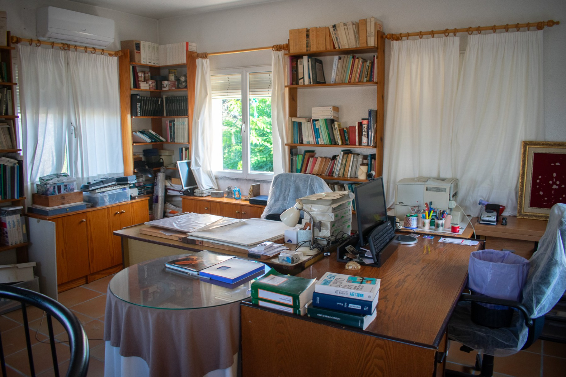 Op de eerste verdieping bevindt zich een zolder die is omgebouwd tot een open ruimte. Deze ruimte wordt momenteel gebruikt als kantoor en is omgeven door panoramische ramen die de kamer overspoelen met natuurlijk licht en uitzicht bieden op de tuin.